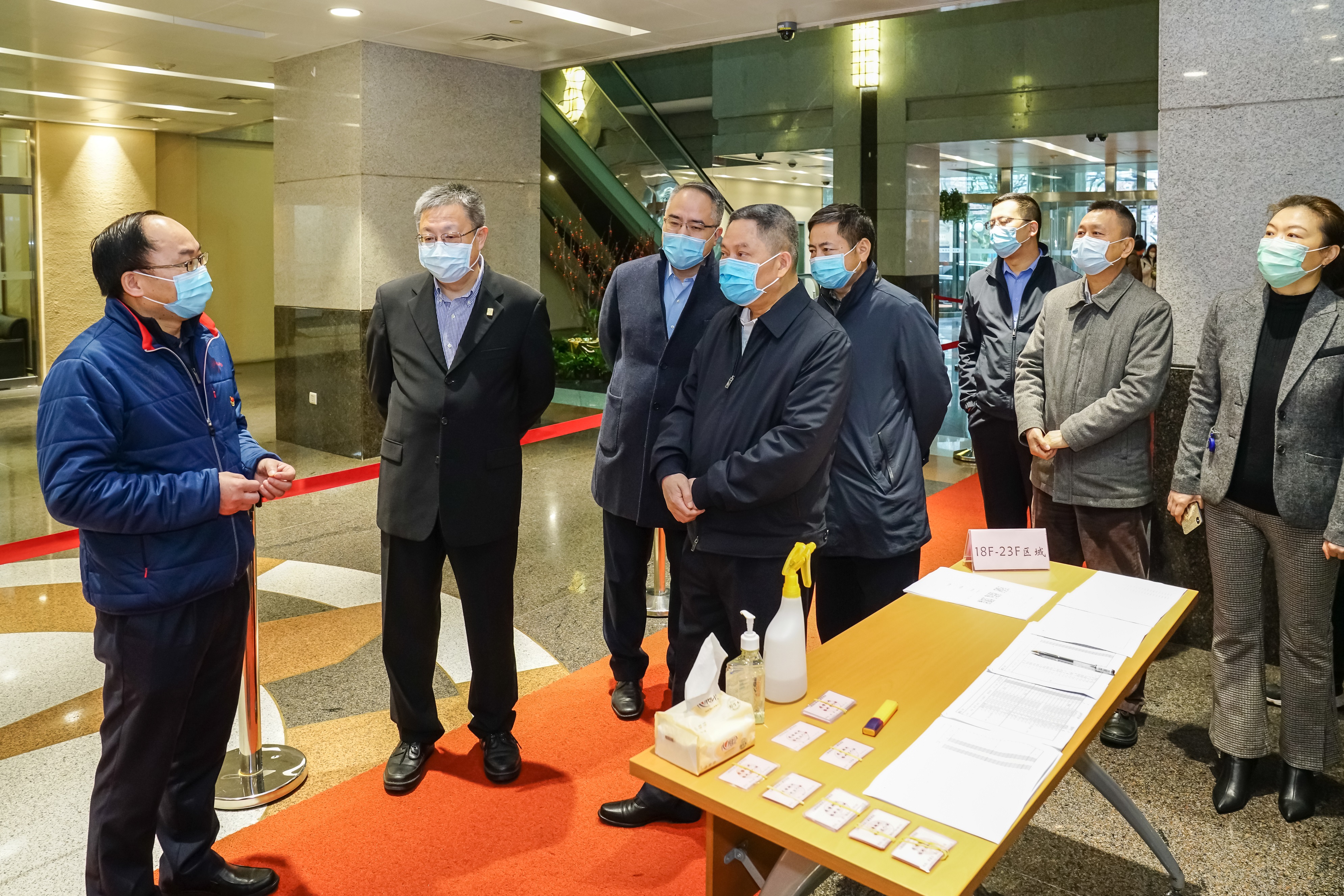 Gong inspected the epidemic prevention and control of SIG Building, listened to a report on the implementation of the building's epidemic prevention and control measures at the lobby on the ground floor, and extended greetings to frontline employees.