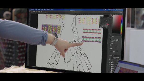 说做就做。很快,上海大学上海美院的设计团队就创作出两件新中式礼服作品。“我们对传统的非遗进行了一系列创新,用上海的绒线编结技艺制作了立体的玉兰花,佤族织锦提取了其中的图案,这些纹样都展现出人民对美好生活的向往。”学院时尚非遗设计师宋天颐介绍道,“在色彩上,我们结合了当季的流行色,进行了再设计、再创造。值得一提的是,礼服面料上的数字喷绘是使用AI生成的。”